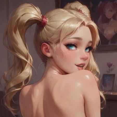 RTX on, 1 girl, 20 years old girl, sexy, cute, fully nude, medium retrousse breasts, petite body, blonde hair, two ponytails, red scrunchies, bright blue eyes, big eyes, detailed eyes, kinky look, on the bed, full body, on her knees, thin waste, thin body, view from behind, looking back, background bed, window, intricate details, <lora:PAseer-SD15-LCM Quick:0.8>, <lora:add_detail:0.3>, <lora:detail_slider_v4:0.5>, <lora:Citadel Spices:0.3>