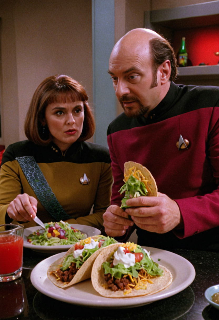 Star Trek TNG, TV still, delicious tacos, masterpiece, best quality, absurdres,<lora:Style_StarTrekTNG-v17:0.8>