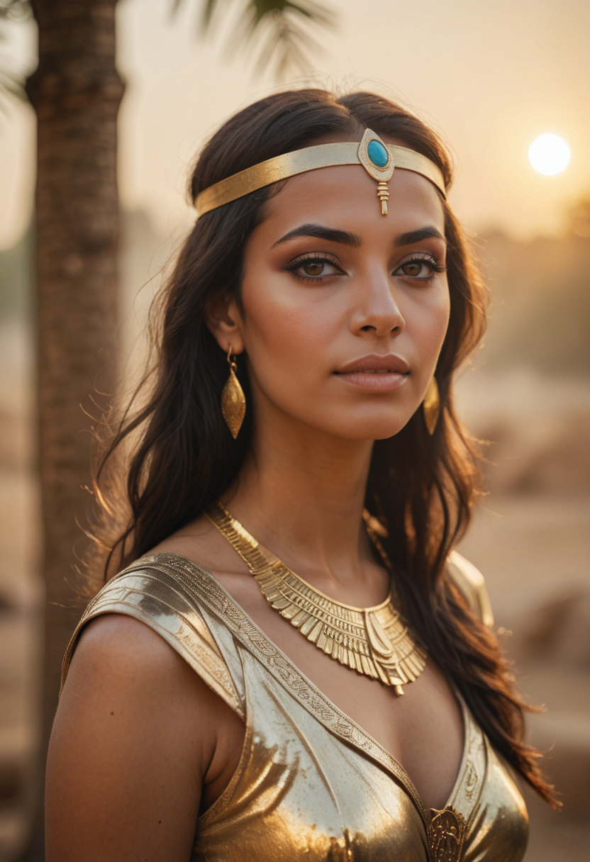 photo of an Egyptian woman, portrait, film grain, airbrushed, photoshop, high resolution, forst, golden hour, mist, bokeh