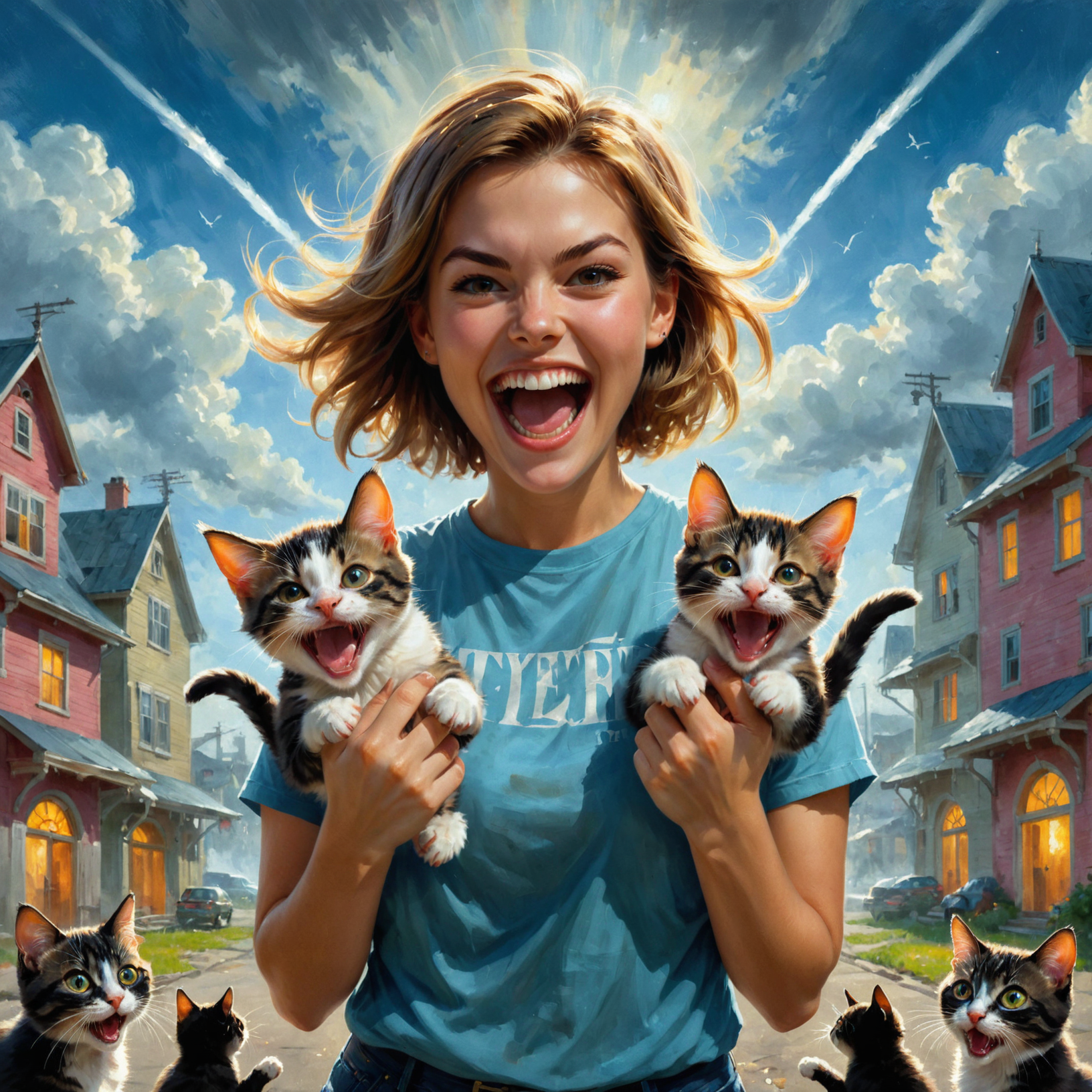 by Paul Lehr and Martine Johanna in the style of Jerry Uelsmann , cute happy woman holding up two cute kittens while laughing maniacally, dual wielding kittens <lora:happy:0.25><lora:maniacal_laughter:1.75><lora:dual_pistols:0.35> , digital painting <lora:digital_painting_envy02:0.60> <lora:more_art:0.30> <lora:midjourney:-0.15> <lora:RMSDXL_Enhance:0.50> <lora:RMSDXL_Creative:0.50> <lora:RMSDXL_Photo:0.50> <lora:RMSDXL_Darkness_Cinema:0.50> <lora:clothing_slider:2.00> <lora:great_lighting:1.50> <lora:aesthetic:1.50> <lora:photorealistic_portrait:1.50> <lora:extremely_detailed:1.50> <lora:dpo:0.25>