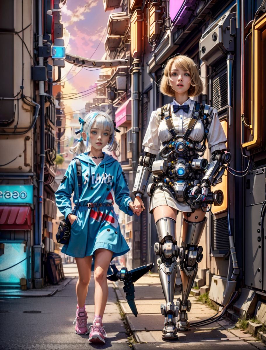 ADDCOMM photography of Gawr Gura and Amelia Watson, Sony a7 IV Mirrorless Camera, wide angle, size_difference, <lora:CyberPunkAI:1.5>,<lora:GrecoRomaPunkAI:0.6>, beautiful face, real face, futuristic,a street in Toulouse, plaza, neon signs, oily ground, (hanging wires:0.6), (running cables:0.7), (purple sky:1.5), (neon lights:1.4), green, aqua ADDBASE CHAR-F vTuber Guwr Gura v4 ,small 18 years old french girl holding hands, ((white hair)), multicolored hair, blue balayage, (red hodded dress:1.3) with white stripe, (red dress:1.6), (mecha shark tail:1.2), pink sneakers, lit badges, red hairclips, small pigtails, oily ground, (hanging wires:0.6), (running cables:0.7), cyber implant, detailled eyes, beautiful eyes, road, ((red and white stripes on dress)), shadow on the ground, "SHARK" writen in white on dress ADDCOL Amelia Watson, a tall 20 years old english woman holding hands, big breasts, blonde hair, bob cut, deerstalker hat, white shirt, bowtie, brown plaid skirt,electronic gadget on utility belt , (robotic leg:1.2), (robot leg:1.2),oily ground, (hanging wires:0.6), (running cables:0.7), neon sign, old tv on the ground, LED strips, pink brick wall, detailled eyes, beautiful eyes, (shadow:1.2) on the ground, ultra-detail, (highres:1.1), best quality, (masterpiece:1.3), beautiful, hires, absurdres