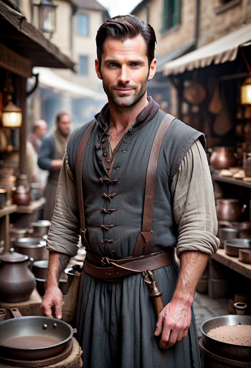 Realistic and detailed close shot portrait photo of a l mediveal male merchant looking a bit like a 35 y.o. Adam Levine , standing in front of a mediveal market stall with pots and pans , smiling invitingly, burning oil hanging lanterns