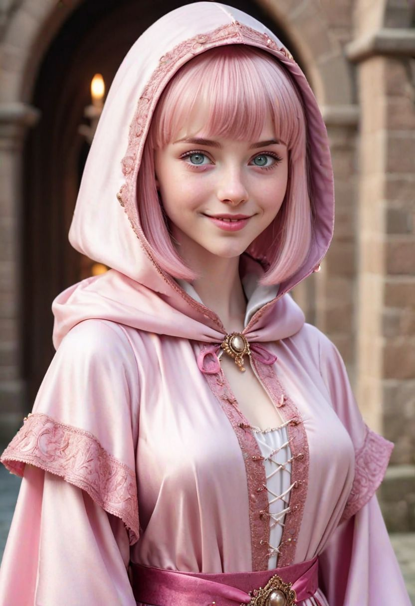 A realistic and detailed cinematic long shot photo of a beautiful young cutesie, short pink hair in bangs, perfect composition, small boobs, wearing an ornate pink mediveal linnen thief robe, deep oversized hood, cheeky grin, dimples, full lips, pale skin, pink hair, bright hair, grey-green eyes, mediveal setting,