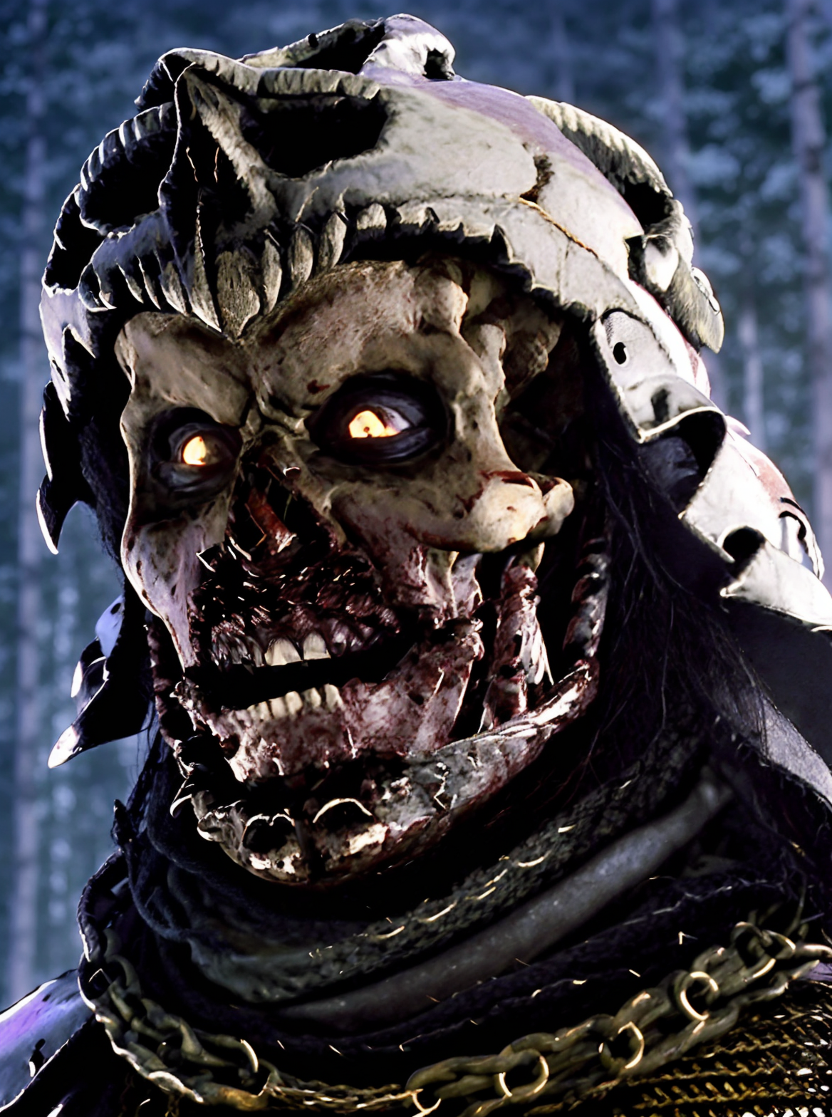 badash, deadite, upper body, medieval armour, horrific face,in the forest, foggy, outside, skull helmet, night time, evil eyes, (profile:0.1)<lora:Ash_Williams_Evil_Dead__Army_of_Darkness:1>