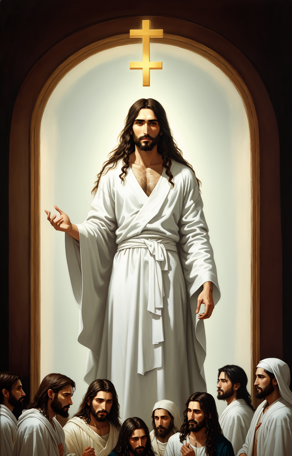jesus with his apostles wearing a white robe and white shirt with neon lights, oil on canvas, oil painting