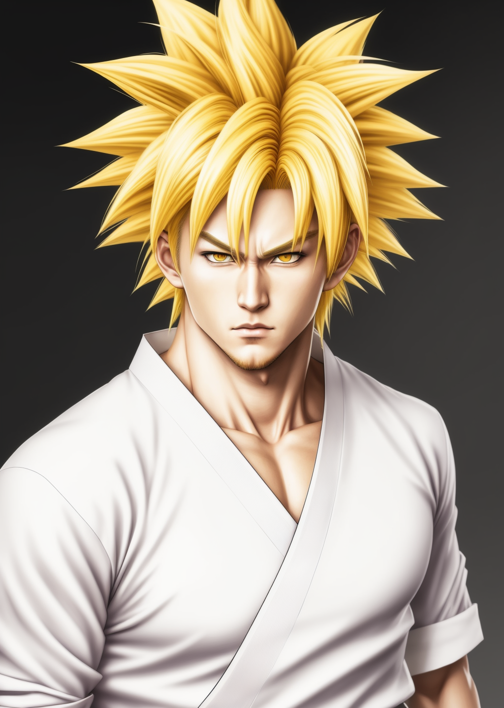 (Realistic:1.5) Colored Manga character, drawing, anime, yellow hair, looks like goku, white karate outfit, male