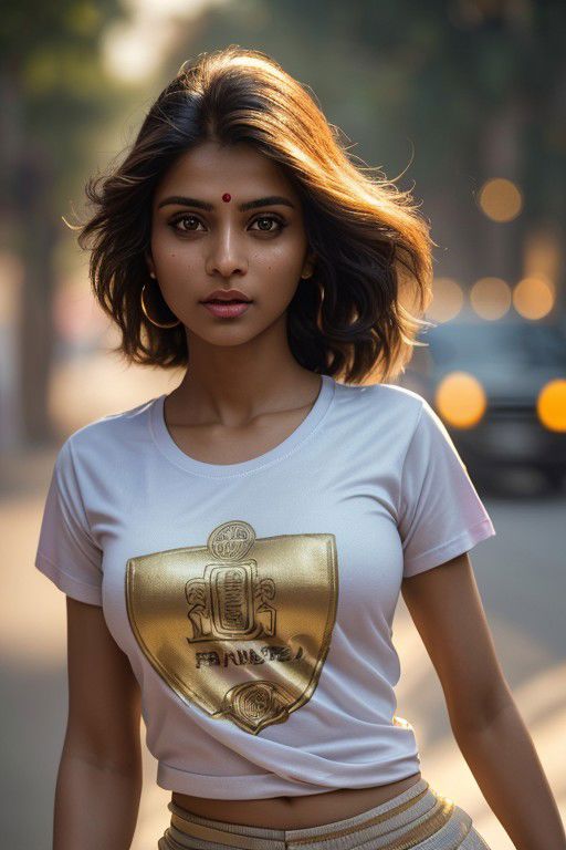 Dollie Nobody SD15 beautiful Indian woman Head shot of a woman running in a city road, wearing a (tshirt with short :1.3) Lighting-Gold foreground objects background details (masterpiece:1.2) (photorealistic:1.2) (bokeh:1.2) (best quality) (color grading) (detailed skin:1.3) (intricate) (8k) (HDR) (cinematic lighting:1.3) (sharp focus) (Clutter-Home:1.2) <lora:epiNoiseoffset_v2:1>