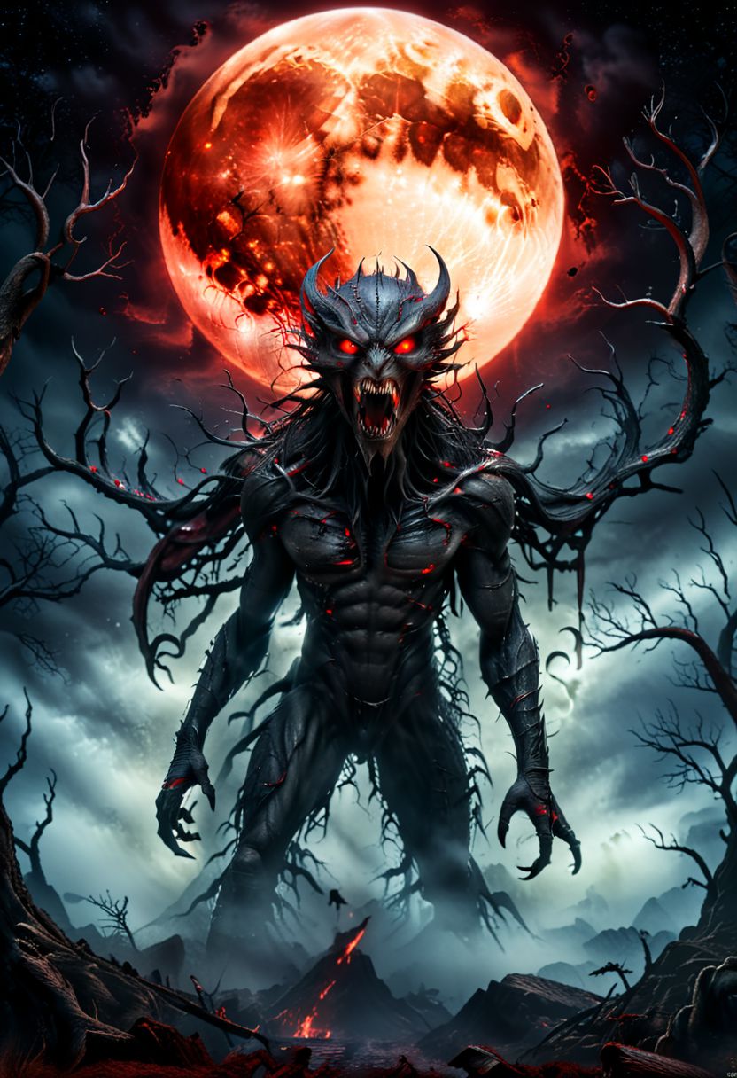 masterpiece, best quality image Create an image of the most evil and wicked creature imaginable. This creature is a nightmarish fusion of dark magic and pure malevolence. It has glowing red eyes that pierce through the darkness, razor-sharp fangs, and twisted, deformed limbs. Its skin is a grotesque, mottled texture, with patches of scales and fur. Surrounding it is an aura of shadow and mist, making it appear as if it is emerging from the depths of a nightmare. The background should be a desolate, eerie landscape with twisted, barren trees and a blood-red moon casting an ominous glow. 8K, high quality, photorealistic, realism, art photography, Nikon D850, 16k, sharp focus, masterpiece, breathtaking, atmospheric perspective, diffusion, pore correlation, skin imperfections, DSLR, 80mm Sigma f2, depth of field, intricate natural lighting,