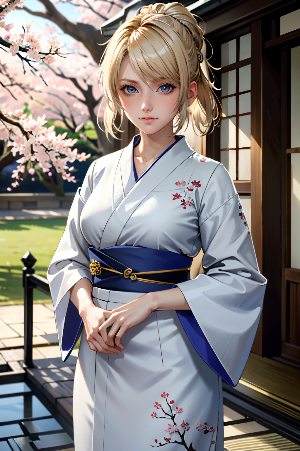 ((ultra detailed, masterpiece, absurdres)) <lora:FFLuna:0.8> FFLuna, 1girl, blonde hair, looking at viewer, in a traditional kimono, surrounded by cherry blossoms