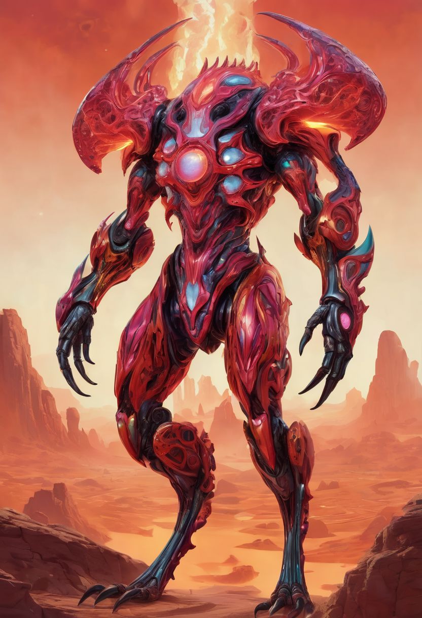 Psychedelic amoeba beast creature, ultra-realistic, highest quality, fire vibrant and red colors with iridescent patterns, hybrid bio-mechanical iron armor seamlessly integrated with organic, fluid forms, intricate mechanical components with glowing accents, amorphous body shape constantly shifting and morphing, set against a surreal, otherworldly background with floating geometric shapes and ethereal light effects, evoking a sense of surreal wonder and alien darkness
