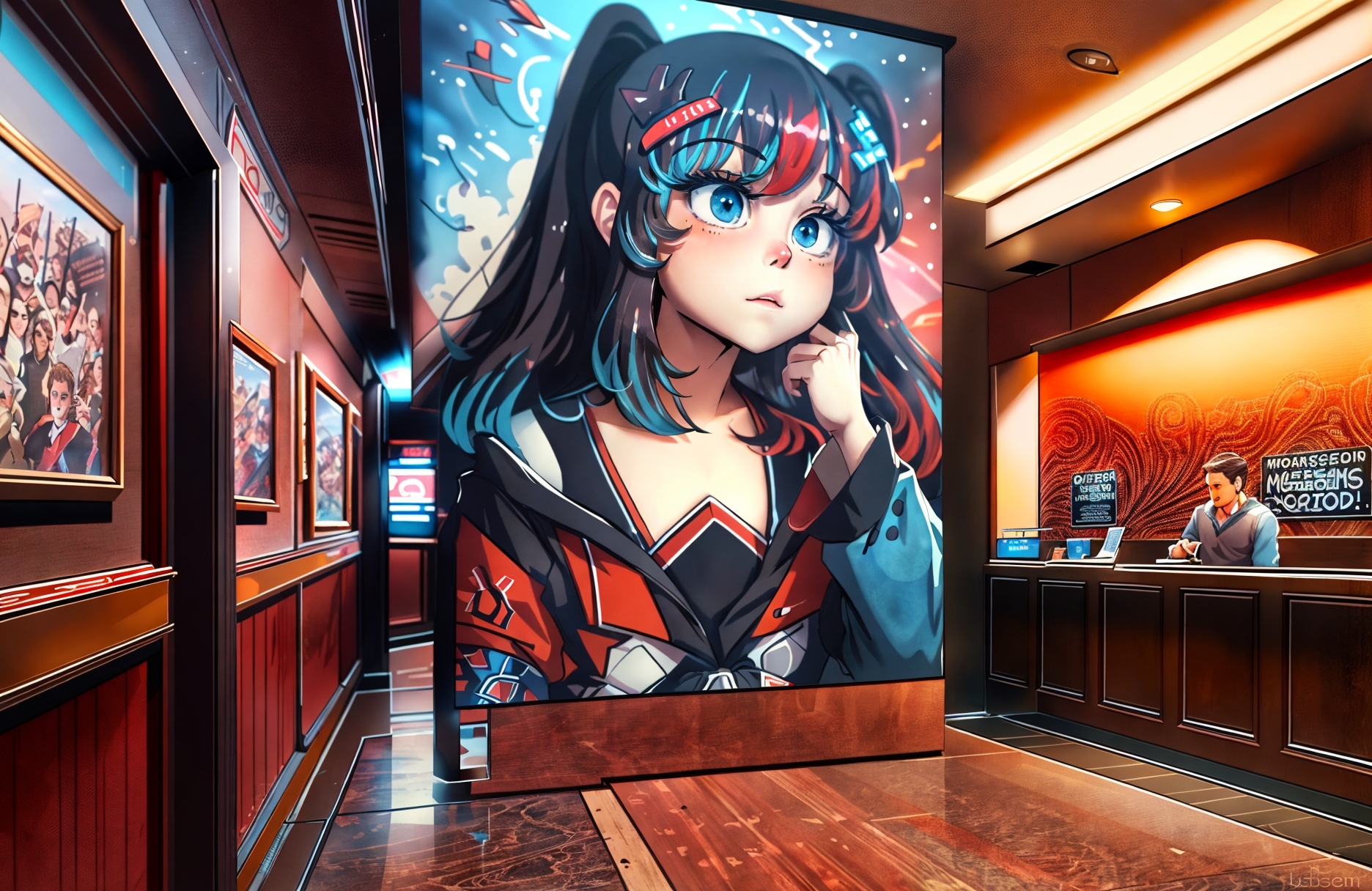 grainy,best quality, masterpiece,detailed illustration, BREAK <lora:Switchchan:0.65>, , (switch-chan:1.1) watching posters with writing and pictures, thinking face, tilting head, annoyed, BREAK movie theater lobby