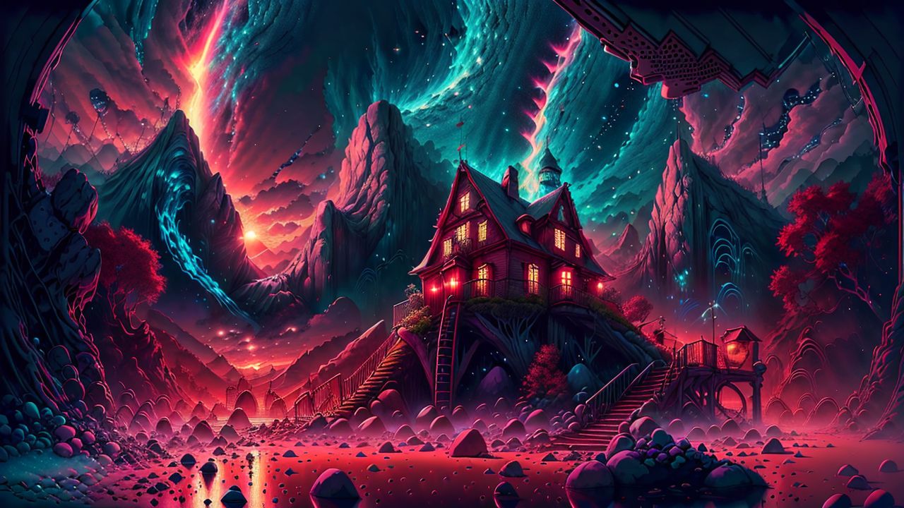 fantasy00d,Pastels artwork,landscape of a Mythical [Geneva:Beach house:3] and Belle poque Red Dwarf,at Sunset,Energetic,50s Art,Cathode tube,(art by Abram Efimovich Arkhipov:0.8),<lora:fantasy00d-000015:1>,