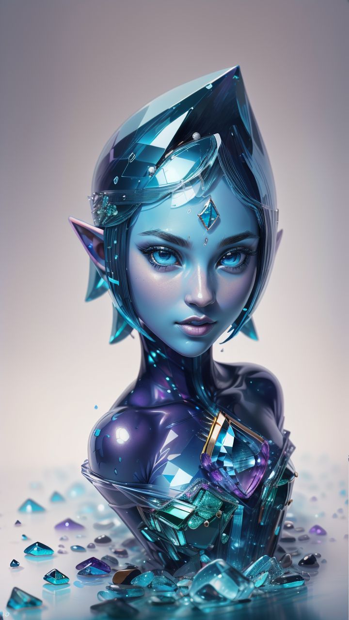(best quality:1.2) (4k:1.) (very high resolution:1.1),(realistic photograph:1.1),(ultra detailed CG:1.1),official concept art,sculpture made of crystal,no human,1girl elf,solo,(detailed face:1),(small breasts:1),full body,transparent body,sitting,<lora:crystal_v1:1>,(phcrystal:1),colorful crystal,gems,(translucent),(transparent),reflection,RTX,lay tracing,<lora:FiSS4:1>,blue eyes,blank eyes,no pupils,colored skin,blue skin,blue hair,body jewel,forehead jewel,(full body),<lora:GlassTech-20>, glasstech,