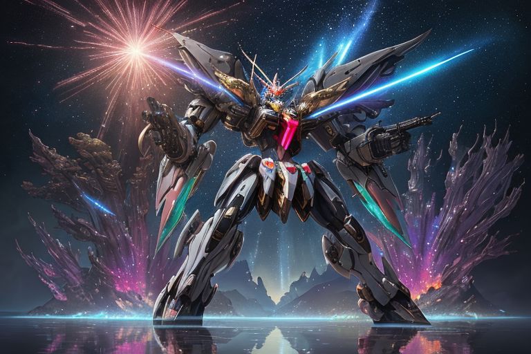 Cute watercolour fantasy illustration by Brian Kesinger, aesthetic, photorealistic, Digital Painting, very detailed high resolution, Studio Ghibli, Anime Key Visual, by Makoto Shinkai, Deep Color, Intricate, 8k resolution concept art, Natural Lighting, Beautiful Composition", Broken Glass effect, no background, stunning, something that even doesn't exist, mythical being, energy, molecular, textures, iridescent and luminescent scales, breathtaking beauty, pure perfection, divine presence, unforgettable, impressive, breathtaking beauty, Volumetric light, auras, rays, vivid colors reflects (red and black mecha), gundam, holding rifle, explosion, laser, robot, saint seiyamasterpiece,best quality,ultra-detailed,very detailed illustrations,extremely detailed,intricate details,highres,super complex details,extremely detailed,cowboy shot, caustics,reflection,ray tracing,demontheme,nebula,dark aura,cyber effect, action, ancient japanese architecture,pond, starry sky,skyline, <lora:mecha_offset:1> <lora:more_details:0.2>