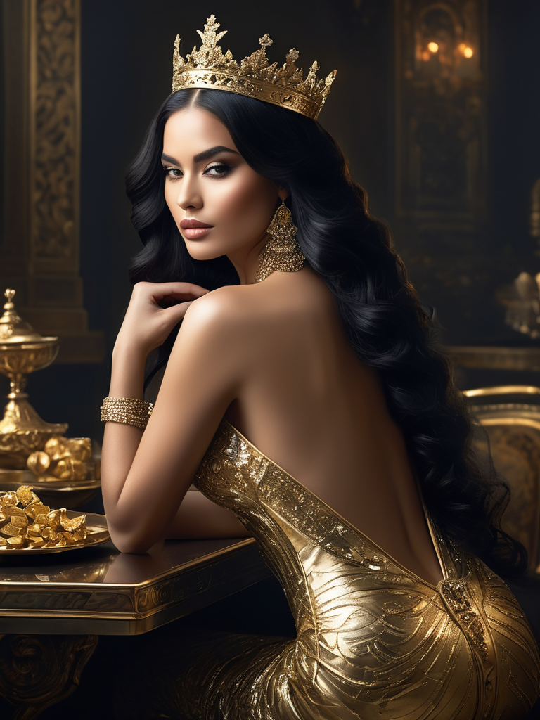 A highly detailed digital painting of a beautiful woman with long, black hair adorned with a crown. She is sitting at a table with gold-plated items, her back turned towards the viewer while she looks over her shoulder with a slightly mysterious and seductive expression. Her back is bare, showcasing smooth and shiny skin. The pose accentuates the curves of her back and neck, creating a sensual and elegant image. Bright highlights and deep shadows create a dramatic effect, with the light coming from the side to emphasize the contours of her body. Pay special attention to the realistic texture of her skin and hair, as well as the luxurious details of her crown and the golden items on the table. The background should be dark, allowing the subject to stand out. The overall composition should be harmonious, with all elements working together to enhance the character's mysterious, captivating, and slightly erotic presence. In the style of WLOP