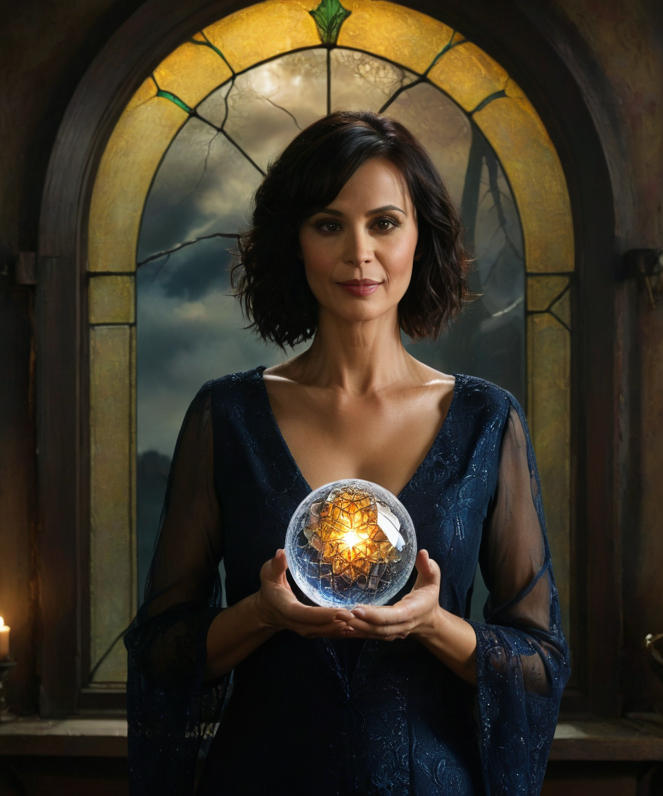 Dark Art Painting Style,catherine bell woman is "The Good Witch",summoning a magical crystal ball of energy that is emitting light,in a dark spooky attic,smirk,stained glass window in the background,stormy night with lightning strikes outside the window,dark,black,dark attic,night time,4k textures,<lora:catherine bell v3a:1>,<lora:Dark Art Painting Style:1>,