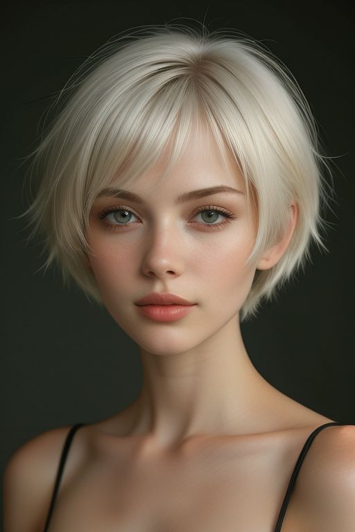 bellissima, 1girl, short hair, white hair, bob haircut, bangs, short, cowboy shot, realistic