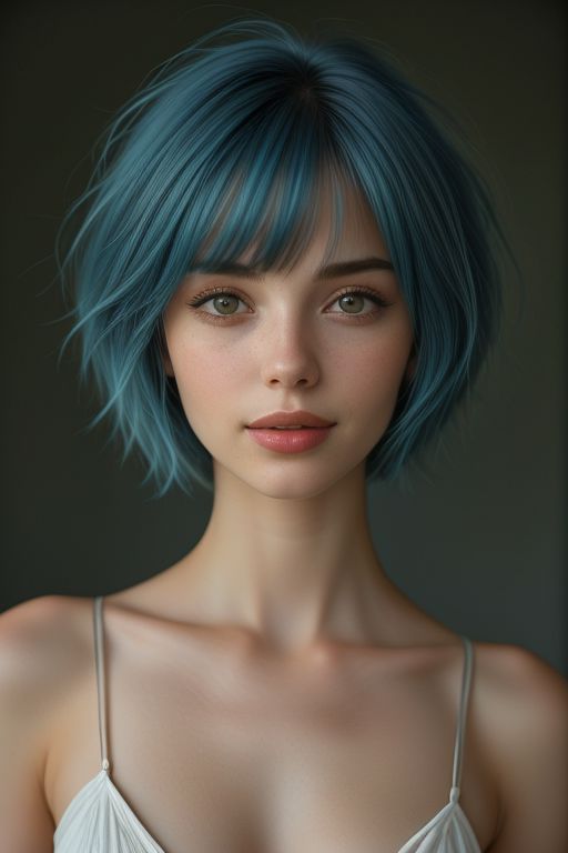 bellissima, 1girl, short hair, smile, blue hair, bob haircut, bangs, short, cowboy shot, realistic