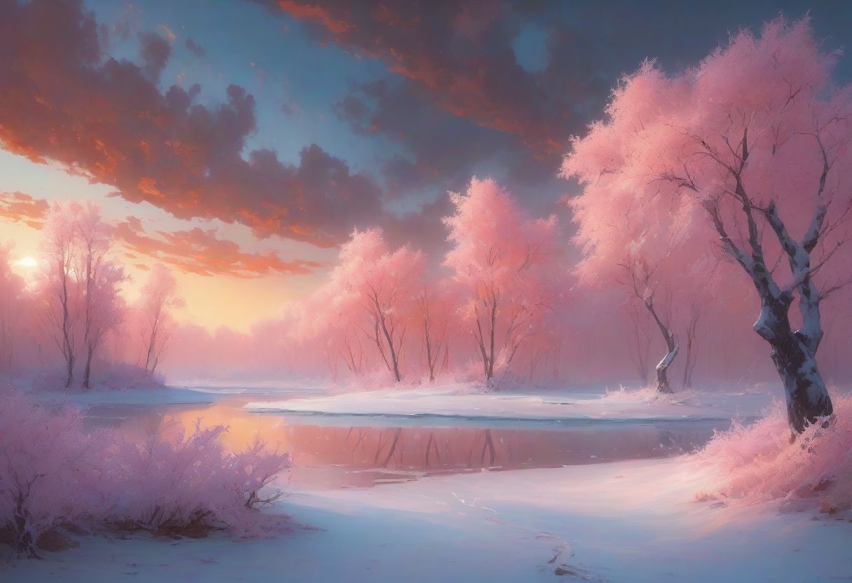 a surreal landscape, where the ground is made of clouds and the trees are made of ice The scene is filled with a sense of other worldliness and intrigue, as the viewer is transported to a world unlike any other. The sun casts a pink and orange glow over the scene, illuminating the delicate ice branches and the billowy cloud ground. The scene is quiet and peaceful, inviting contemplation and reflection.
