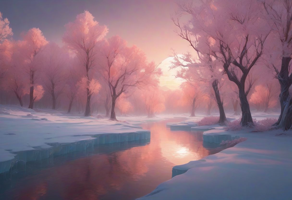 a surreal landscape, where the ground is made of clouds and the trees are made of ice The scene is filled with a sense of other worldliness and intrigue, as the viewer is transported to a world unlike any other. The sun casts a pink and orange glow over the scene, illuminating the delicate ice branches and the billowy cloud ground. The scene is quiet and peaceful, inviting contemplation and reflection.
