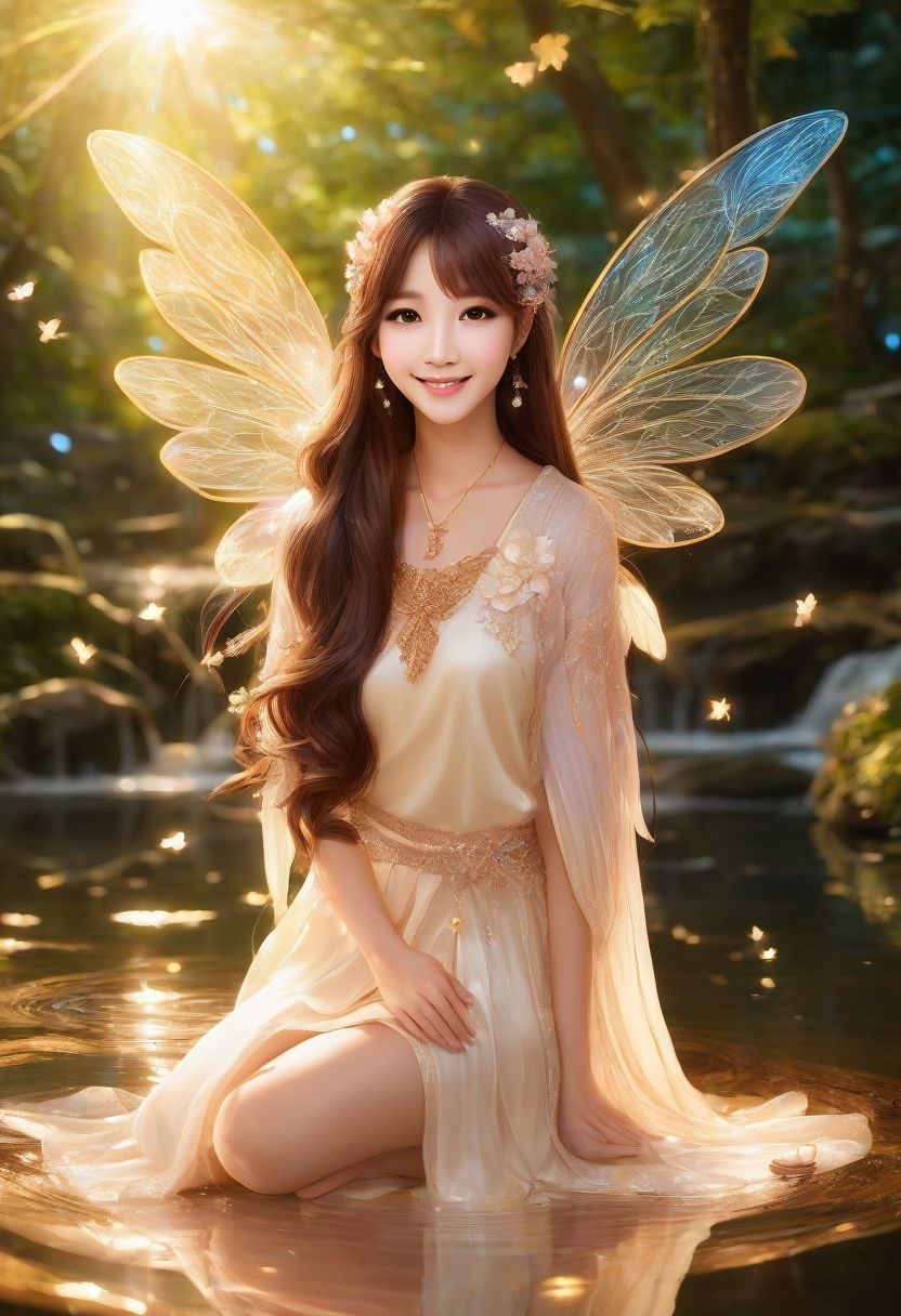 Dreamland with a japanese dreamfairy, looking at you, smiling, long hair, wide smile, (visible face, nose, mouth and feet:1.10), (crystal wings:1.10), (brown long hair:1.05), (brown eyes:1.05), magic_theme (greetinsg you:1.10), hand palms pose, standing pose.