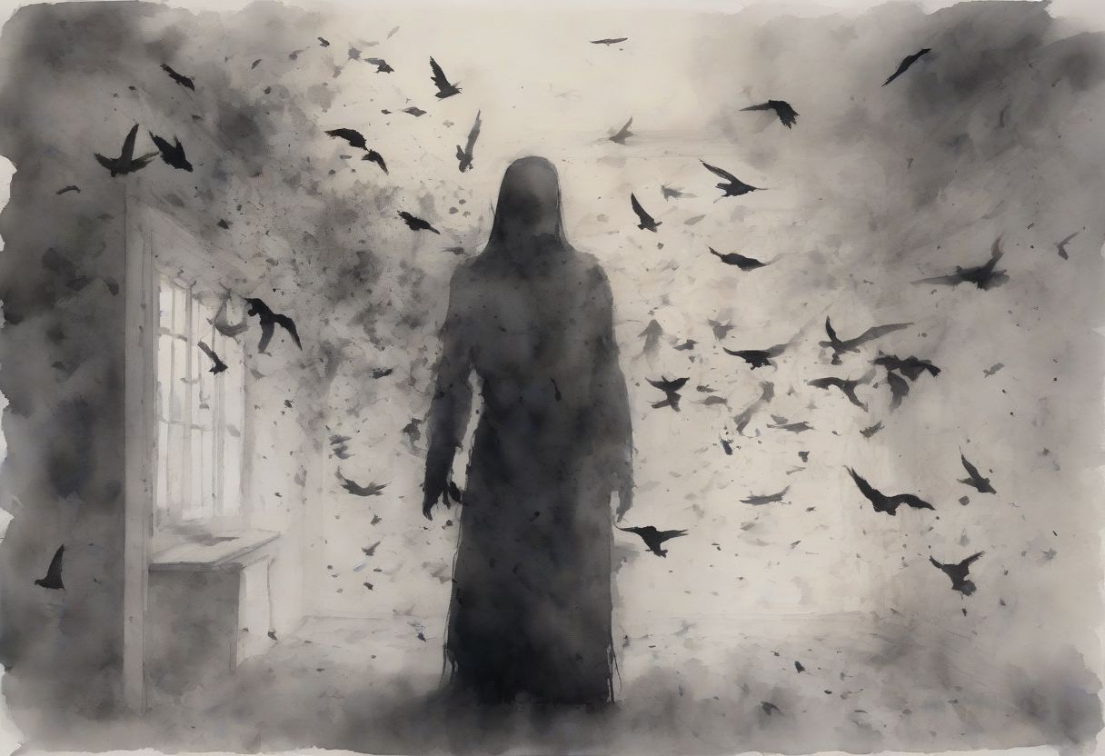 shadowy figure, like smoke, wisps of smoke, blown apart, dissolving lika a flock of birds, in a room, bleak, grey, watercolor