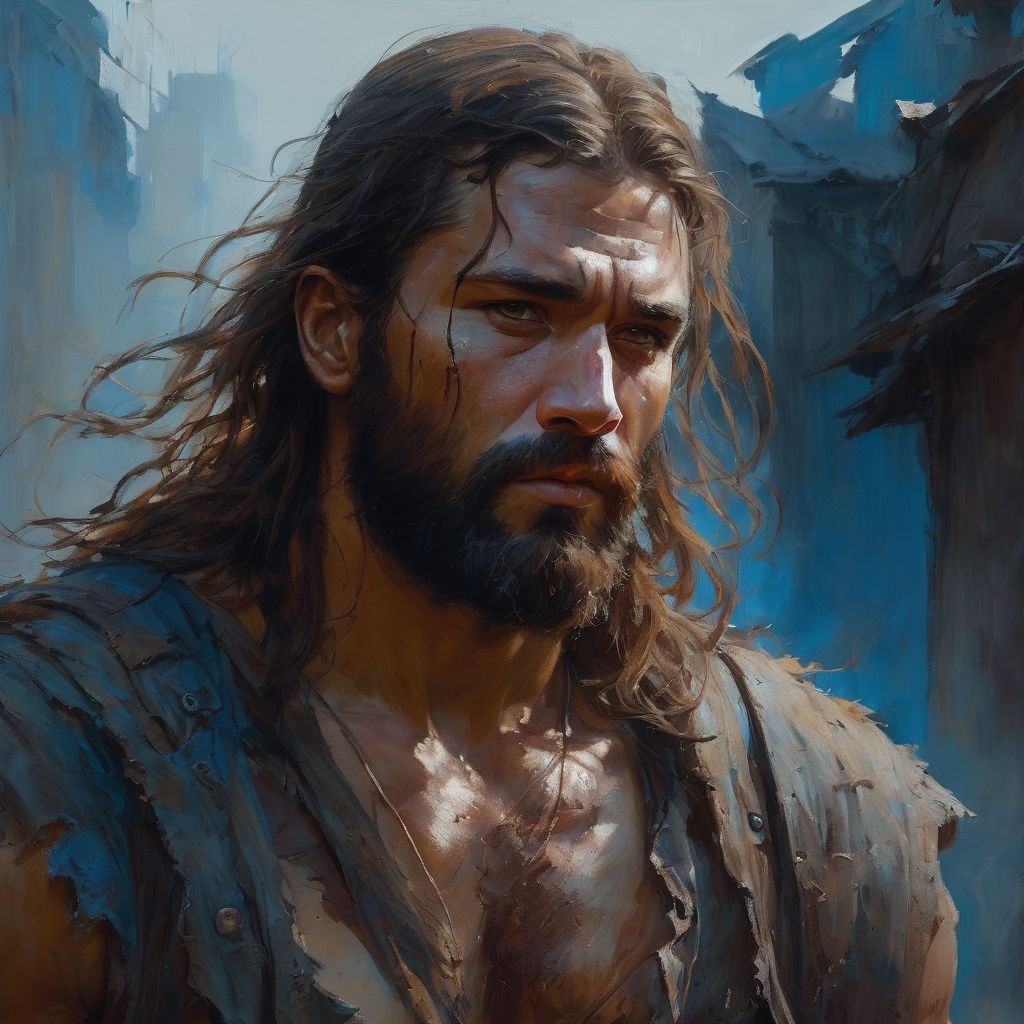 fantasy painting brushstrokes, modern, (post-apocalyptic:1.5), amazing quality, male, detailed face, long loose brown hair, thick brown beard, muscular, messy, simple armor parts, tattered clothes, exposed chest, portrait, midnight, more blue, cinematic composition, soft shadows, darker blue lighting