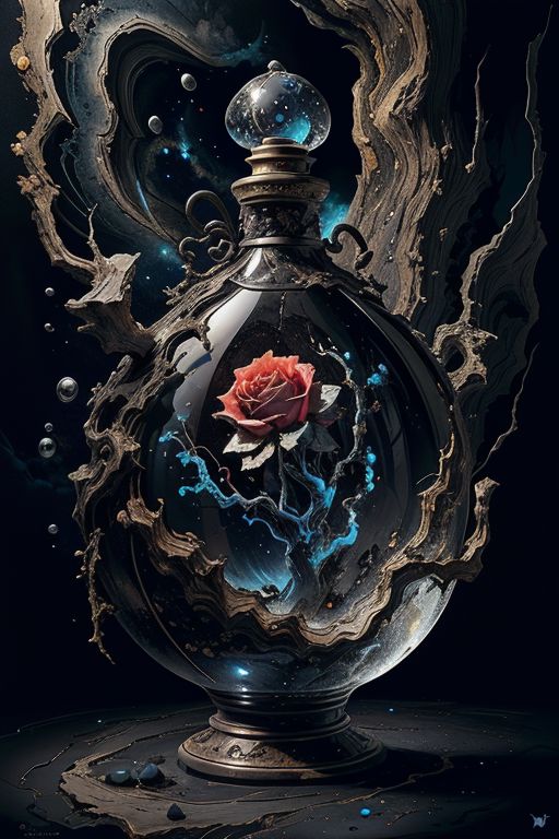 ultra realistic 8k, masterpiece, dark, two luscious heliotrope roses, black background, yellow cracks, (dark black leaves and stem), (blue nebula swirls, cracks), vortex, (((ruby heart in a perfume bottle, 1/3 rule, one third rule))), liquify