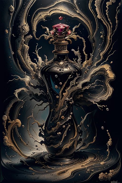 ultra realistic 8k, masterpiece, dark, two luscious heliotrope roses, black background, yellow cracks, (dark black leaves and stem), (blue nebula swirls, cracks), vortex, (((ruby heart in a perfume bottle, 1/3 rule, one third rule))), liquify, plastic liquid, bright purple liquid, (under water)