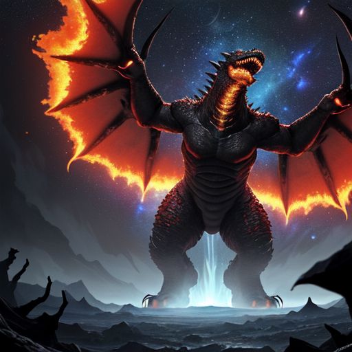 **Hellish Space Godzilla** A colossal, otherworldly creature stands against the backdrop of a starry void, its massive form illuminated by the eerie glow of distant galaxies. This Godzilla variant is a monstrous fusion of cosmic terror and demonic fury. Its scales are blacker than the deepest void, absorbing all light and radiating an ominous, crimson aura from the cracks between them, as if magma coursed through its veins. Its eyes are burning embers, glowing with a malevolent intelligence and hatred that pierces the soul of anyone who dares to meet its gaze. Jagged, obsidian-like spikes run along its spine, crackling with fiery energy and sporadically erupting with bursts of infernal flames. Its claws and teeth are razor-sharp, dripping with molten lava that sizzles and hisses in the vacuum of space. The tail is long and serpentine, covered in smaller spikes and ending in a bladed tip, capable of slicing through asteroids as if they were made of paper. Wisps of dark smoke and embers follow its movements, leaving a trail of destruction in its wake. In the backdrop, dying stars and shattered planets float, evidence of the cosmic devastation this hellish creature brings. The very fabric of space around it seems to warp and twist under the weight of its otherworldly presence, making it clear that this is no mere monster, but a god of destruction.