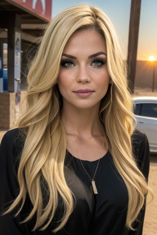 A portrait of a young woman with blonde hair and green eyes focus on camera. She has long blonde hair and is wearing a black blouse with lace. She is standing in the desert next to a rusty gas station. It is evening, the sun is setting, and it is windy.