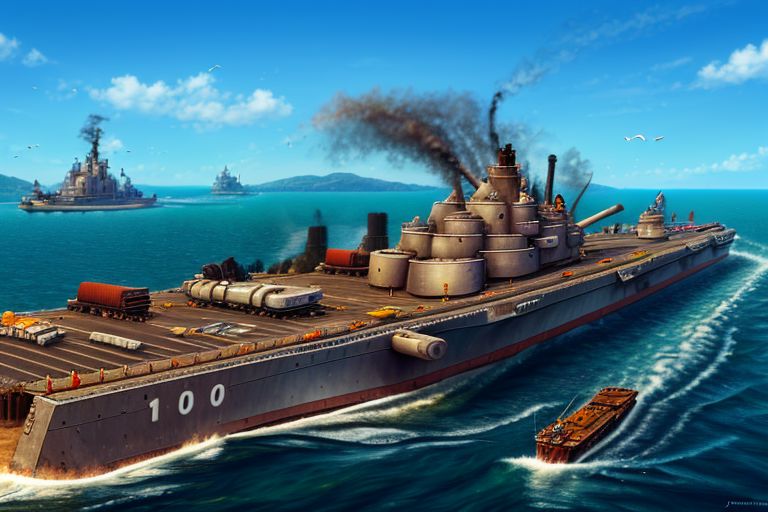 jakubRozalskistyle, island, battleships docked at port, sunny weather, birds in flight, mechs moving cargo, some mechs have cannons attached to them,