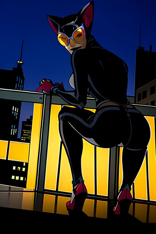 beautiful eyes, beautiful girl, high detail skin, high detail eyes, high detail hair, highres, ultra detailed, sharpen picture, Highly detailed, masterpiece, best quality, photorealistic, <lora:Catwoman2004LoRA:0.9>1girl, cat ears, black bodysuit, goggles, mask:1.4, gloves, sharp fingernails, black high heels, squatting on a high building, at night, city lights in background, from behind