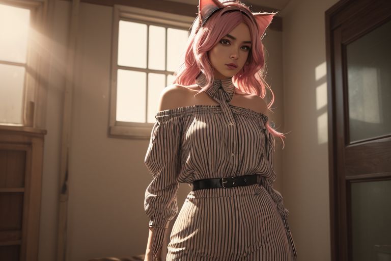 (masterpiece, best quality, hires, high resolution:1.2, 4k, 8k , high quality),score_9, score_8_up, score_7_up, pink hair, green hair, two-color hair, braided hair, dark brown eyes, large breasts, looks at the viewer, aggressive look, cat ears, fluffy tail, cat girl, ((neko)), long tail. extremely detailed, realistic, intricate detail, hirs, 1girl, solo, (large breasts, thick thighs, wide hips), curved back, (cinematic lighting, sunlight, perfect lighting, backlighting), eye level shot, extreme close-up shot, looking at the viewer, <lora:PrisonClothesOfMerkuriaV1[prison clothing, metal collar, off the shoulders][striped headdress]:0.8> prison clothing, striped, off the shoulders, striped headdress