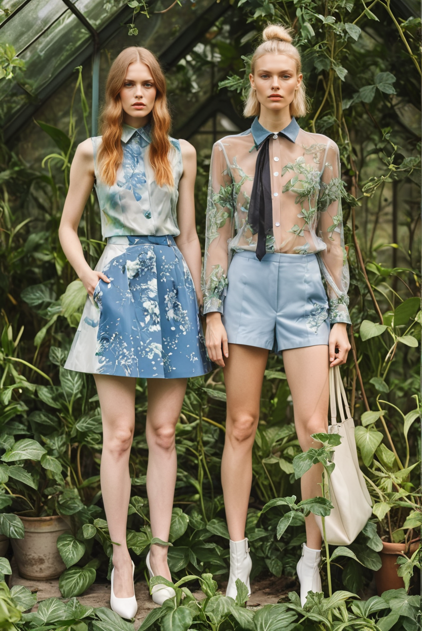 two woman standing in a greenhouse with a plant in the background and a large window in the background with a <lora:MJ52:0.65><lora:Fine art photography style:0.45> Fine art photography style <lora:SDS_Contrast tool_XL:1> <lora:add-detail-xl:1>