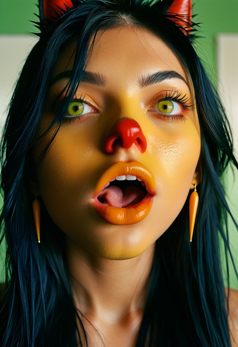 hyper-realistic, real life, analogue style, raw, photo, a large orange face, large bright yellow eyes, a mouth, thick green lips, a large red nose, pointed blue ears, long black hair, ( spiked_hair), real world location, indoors,