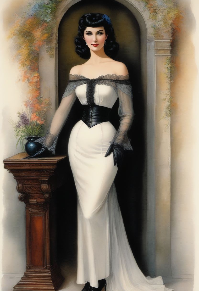 Water color full length portrait, betty page, standing delicate corsets, tall black leather high heel boots, opera length black leather gloves, off the shoulder low cut white blouse, tight laced long skirt, white lace, narrow waisted, smooth full bosom, historical beauty, classical, powerful, pretty bosom, art nouveau, pencil and ink, Susan Boulet, Josephine Wall, stern looking, fine line colored scribble art antique fantasy