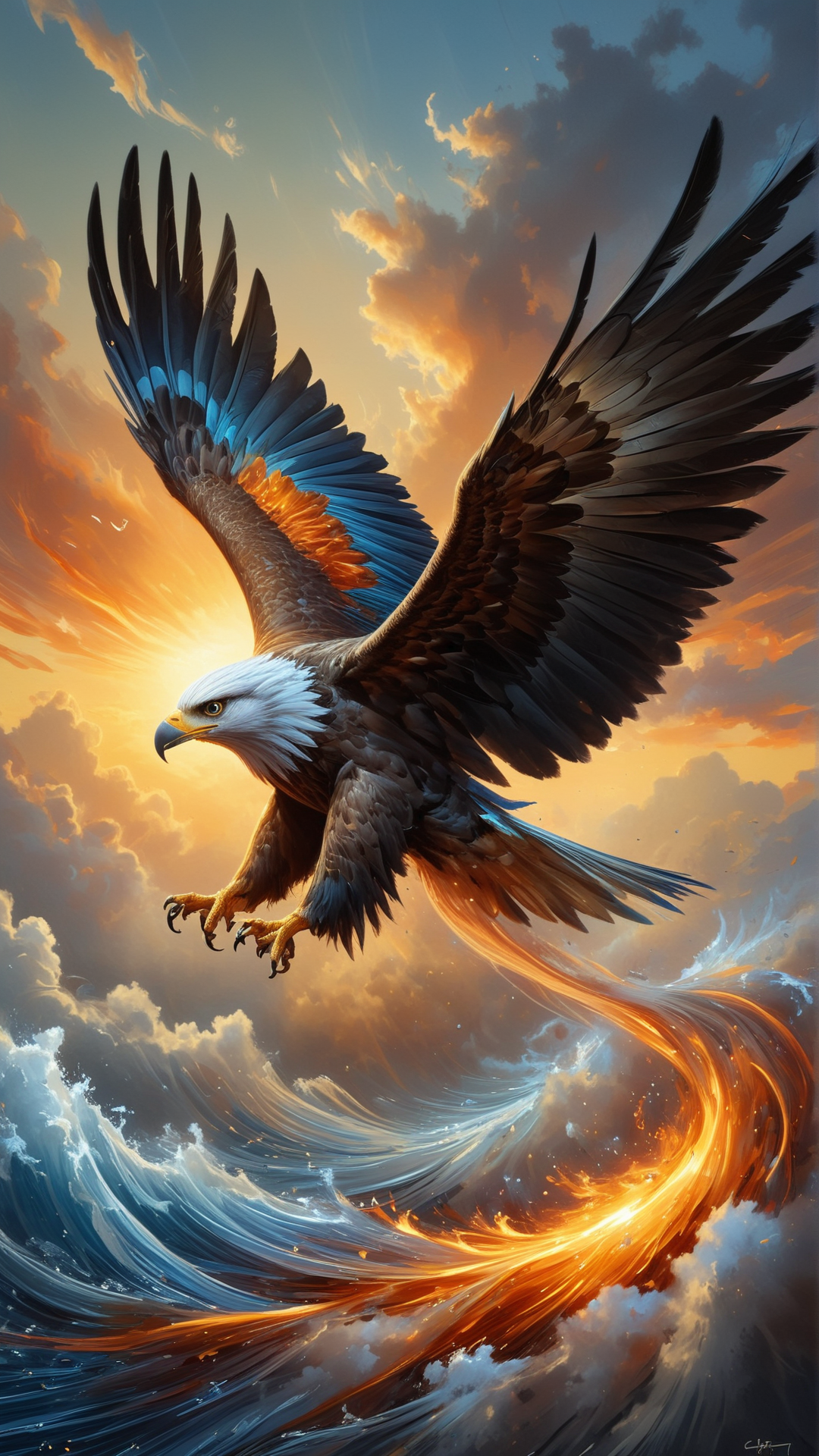 <lora:ElementsMixSDXL:1.0> ElementsMix (Wind:0.6),(Fire:0.5),(Earth:0.8),(Water:0.8) (Realistic oil painting, soaring eagle, powerful wings spread, piercing blue eyes, golden beak, detailed feathers, vibrant colors, cloudy sky, sun rays, dynamic motion, awe-inspiring, high-resolution, dramatic lighting, texture, masterpiece, vivid, captivating, emotional, breathtaking, professional, exquisite, grandeur, inspiring, meticulous, striking, capturing the essence of freedom and grace:0.6), detailed background