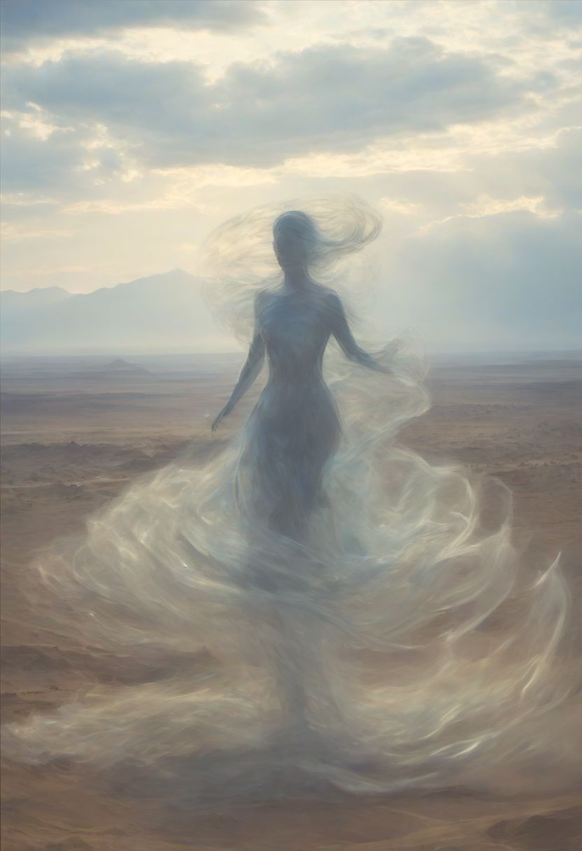 a stormy scene with lightning in the background, in the center of the image is a large glass sculpture of a woman levitating high in the sky, the glass woman is glistening in the sunlight against the storm, inside the glass sphere an air elemental which looks like smoke, the glass woman is levitating in mid air and is surrounded by a veil of smoke, stormy sky with lightning in the background, looking up at the glass sphere with the ground far below