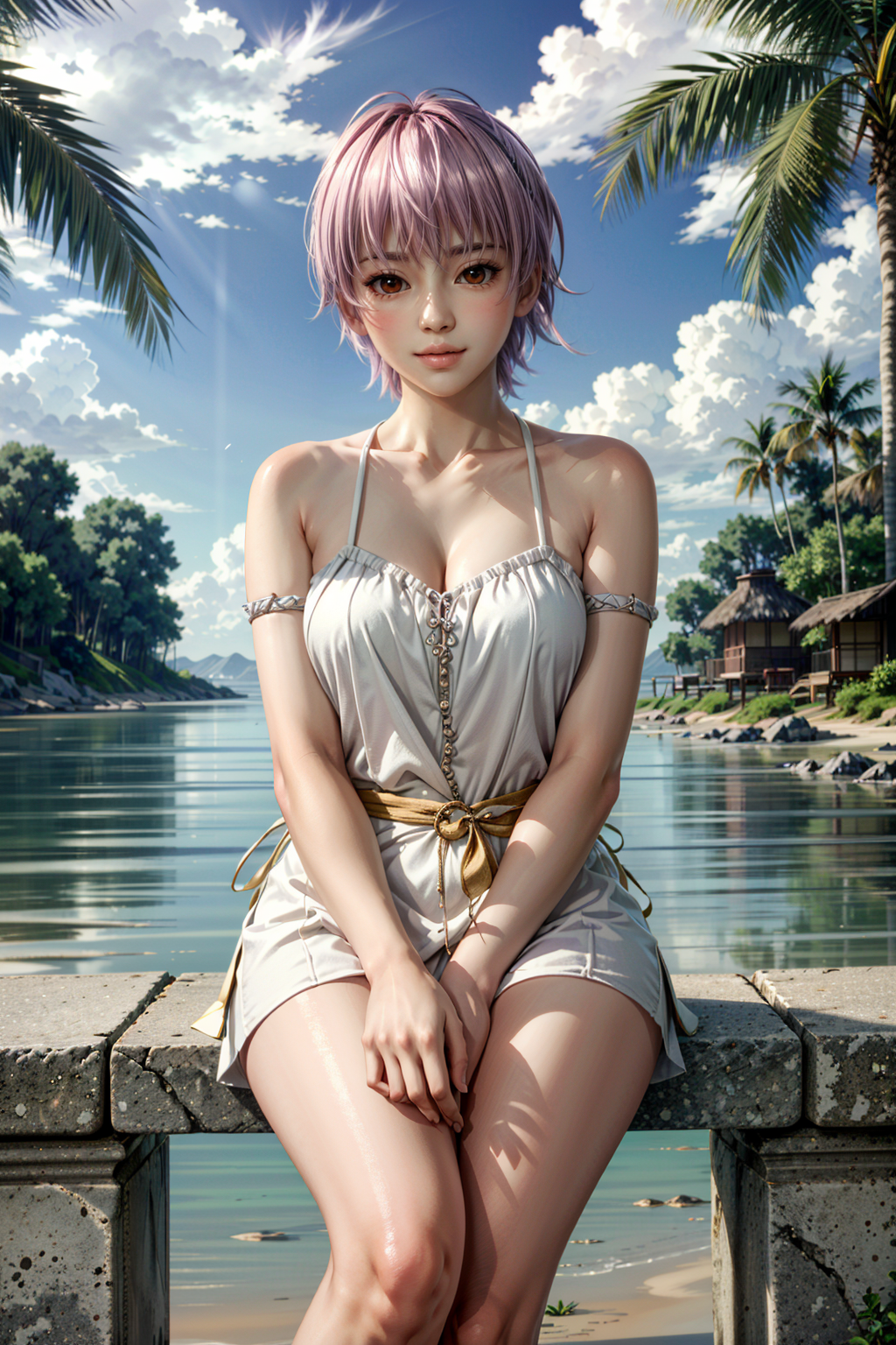 (masterpiece, best quality:1.3) <lora:epi_noiseoffset2:1> <lora:add_detail:0.7> <lora:DOAAyane:0.8> DOAAyane, 1girl, solo, blush, short hair, full body, sitting, serene coastal lagoon, afternoon, tranquil and soothing with soft sunlight reflecting on calm waters