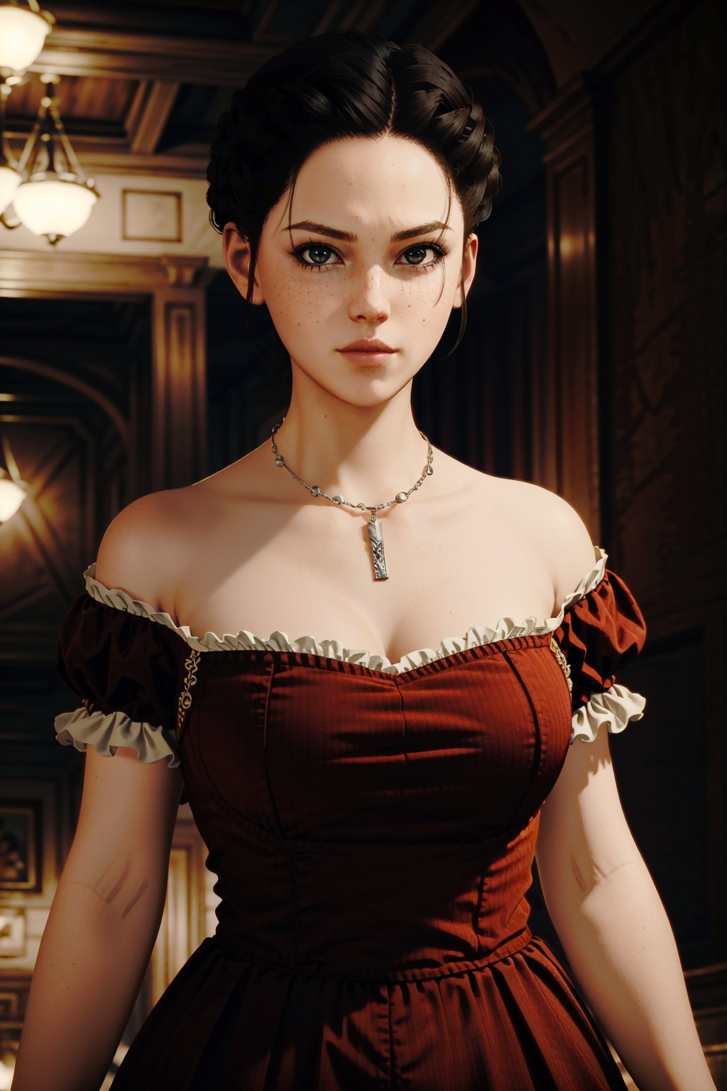 EvieAssa, jewelry, 1girl, necklace, dress, freckles, solo, black hair, realistic, indoors, red dress, blurry, blurry background, upper body, short sleeves, bare shoulders, puffy sleeves, lips masterpiece, best quality, <lora:epi_noiseoffset2:1>, <lora:EvieAssa:0.7>