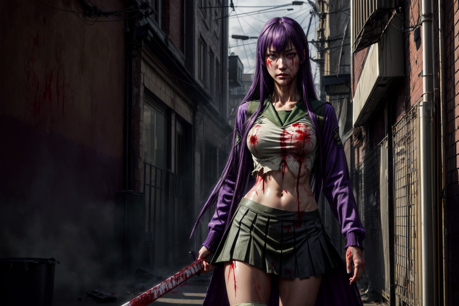 solo, 1girl, saeko busujima, long hair, purple hair, (purple eyes:1.1), hair between eyes, skirt, (torn clothes:1.3),(blood:1.3),(angry:0.8),long sleeves, dark alley,trash,rain,bow, school uniform, serafuku,katana, green skirt, Cosmic Horror <lora:129434:0.7>,<lora:87153:1.2>,finely detailed beautiful eyes, intense gaze, cinematic lighting,detailed face and body,award-winning,(8k, RAW photo, best quality, masterpiece:1.2),ultra-detailed, (high detailed skin:1.2), art by Grzegorz Rutkowski,