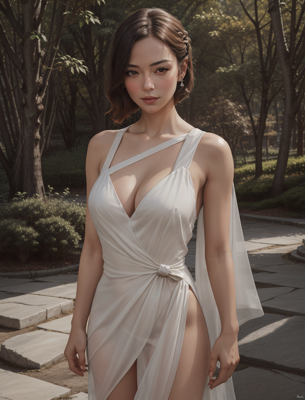 Wide shot of a Sexy busty woman with Silver light hair,braid,hair bow,beautiful detailed face,outdoors, in a beautiful park, posing for a photo,in a meadow,wearing 1shoulder_dress with a cleavage cutout,painterly,portrait,oil on canvas,artstation trending,concept art,highly detailed,sharp focus,illustration,art by artgerm and greg rutkowski and alphonse mucha and Norman Rockwell,high quality,intricate,dreamlike,fantasy, <lora:1shoulder_dress:0.55>