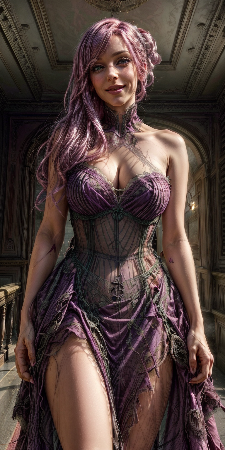 (best quality), (masterpiece), 1girl, green eyes, pink/purple hair, cinematic lighting, realistic, highly detailed face, inside Victorian mansion, wearing torn see trough dress, elegant torn dress, inviting, smiling, hair let down, hand extended to the viewer, pov, <lora:more_details:0.8>, <lora:more_details:0.8>, <lora:see_trough_dress06:0.7>, <lora:unhorny_v01:-1>,
