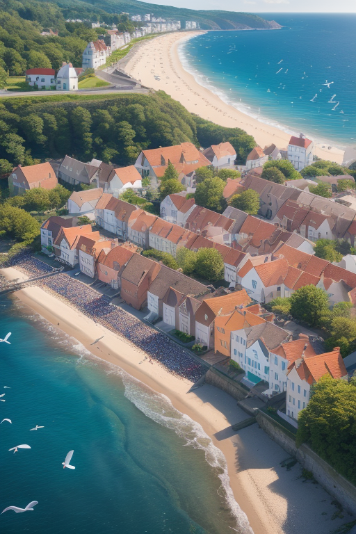 coastal town, village, birds eye view, coast, water, boats, architecture, shoreline, birds, people, scenery, lighthouse, sunny, day, summer, sailboats, far away view, buildings, Direct light, Selective focus, ((illustration)), perfect details, light particles, chromatic aberration, masterpiece, best quality, absurdres, highest quality, amazing details, hyper detail, dramatic light, intricate details, <lora:add_detail:0.6>