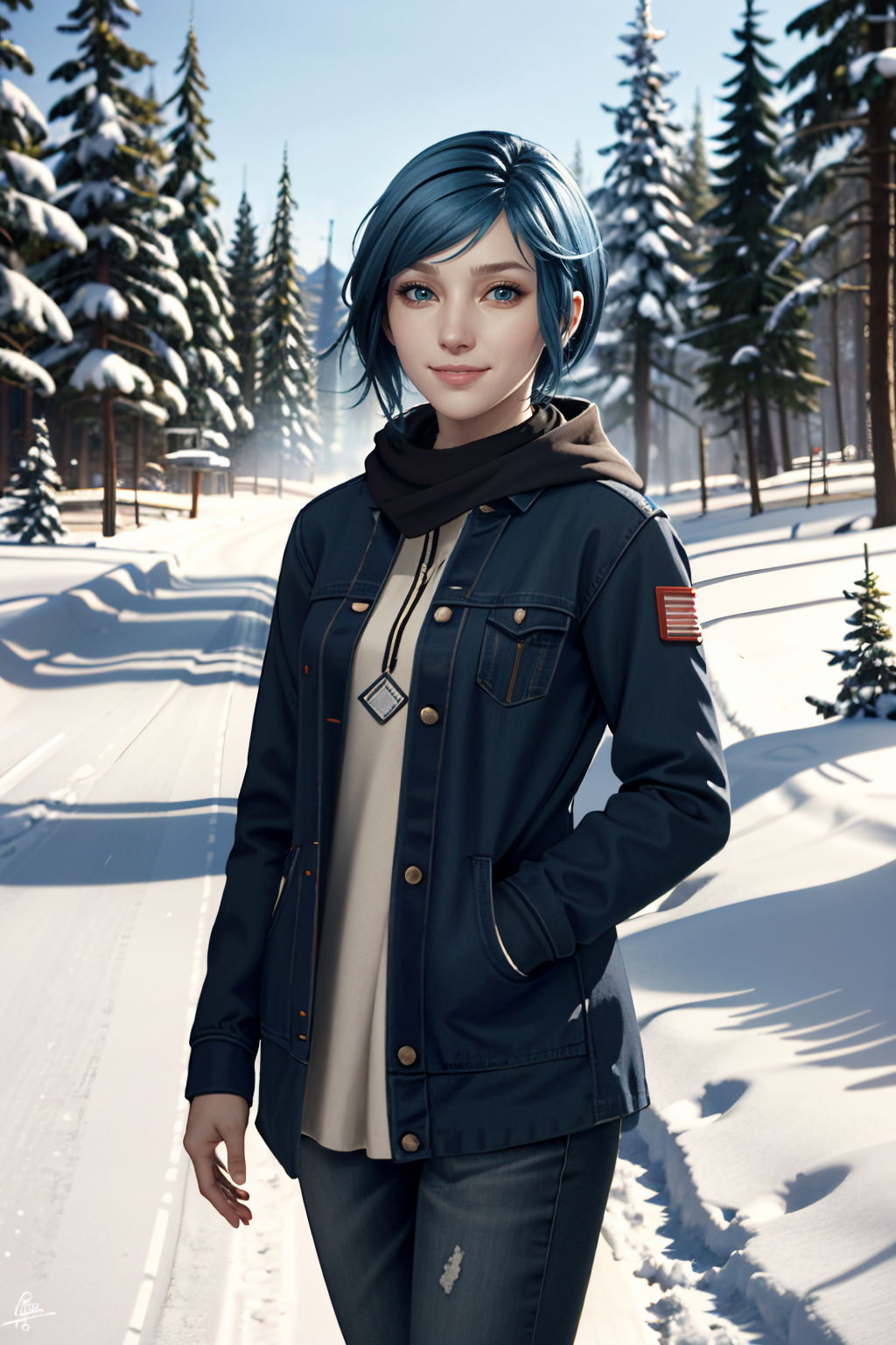 ((ultra detailed, masterpiece, absurdres)) <lora:LISChloe:0.8> LISChloe, 1girl, short hair, blue hair, looking at viewer, in a winter wonderland, cowboy shot, winter clothing, smile