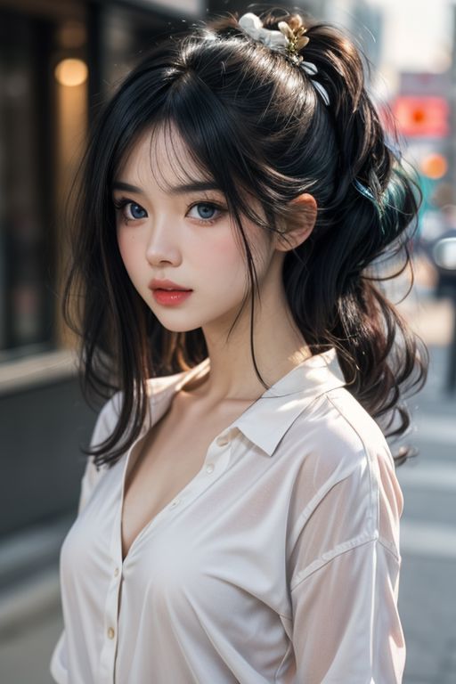 (8k),best quality, (photorealistic,realistic:1.2), 1girl, solo, detailed face, standing,(hair ornament:1.35), (small breasts,breasts out:1.4), bangs, lips,1girl, ((Black hair with white inner color)), 35mm film, one pretty girl, solo, updo, prefect face, makeup, blue eyes,small tits, cleavage, white shirt, looking at viewer, bright lights, softbox lighting, upper body, epiCPhoto,