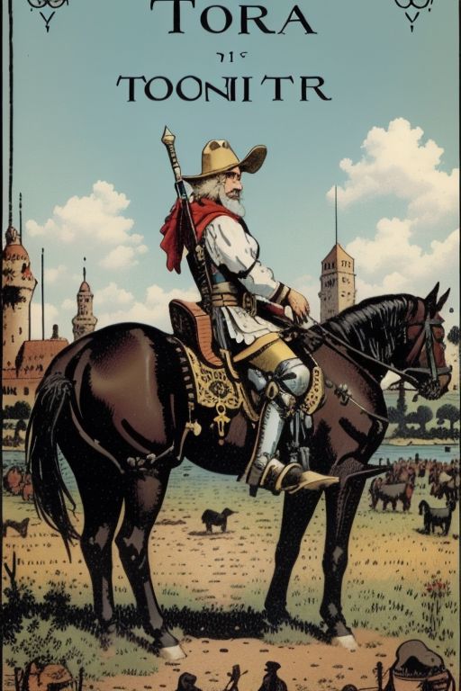 (masterpiece, best quality;1.3),(tarot card:1.2), 1man, male_focus, the tower, enormous looming tower in the background, spanish hat, curiass, old man, beard, don quixote, old horse , lance, outdoors, <lora:Tarotv0.2:0.9>,looking at viewer, long shadow, symmetrical composition, ultra detailed