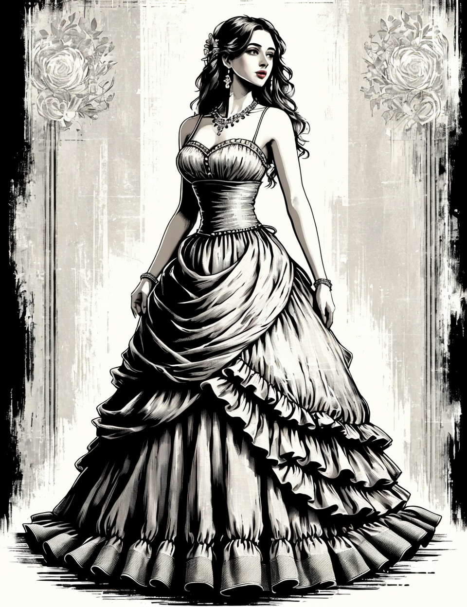 masterpiece illustration, detailed,DonMB14ckB377y loose-fitting full body clothing, sweetheart neckline, linen, rugged, beads, spaghetti straps, tea length, natural waist, ball gown skirt, logo placement <lora:DonMB14ckB377y:1>