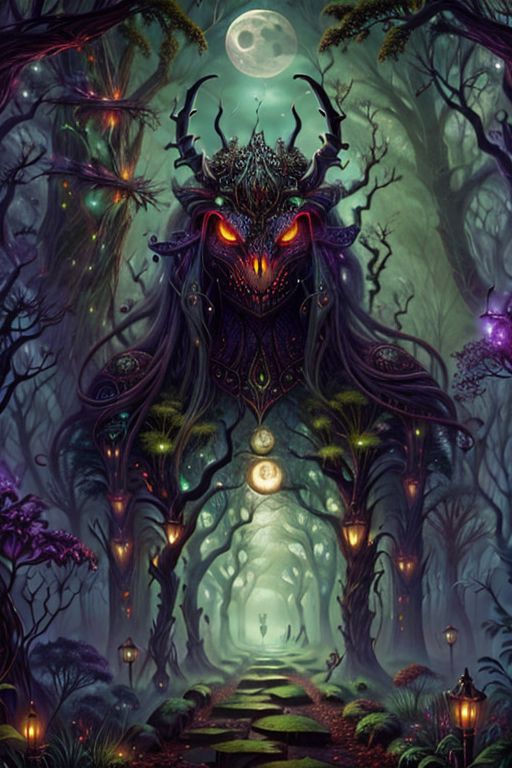 OverallDetail, green theme, moon, path, giant face in the mist, spider focus, menacing face, half-lidded eyes, giant moon looming in background